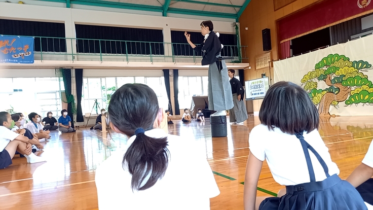 (クラウド支援公演/薩摩川内市立藺牟田小学校「狂言鑑賞と体験ワークショップ」より)