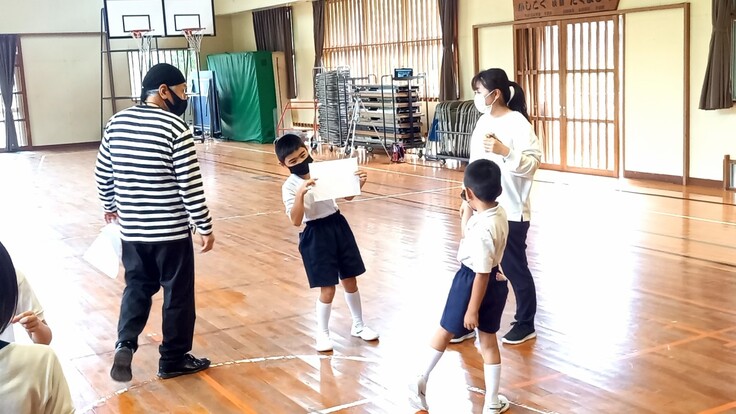 全校児童13名の森山小学校は山間にある緑のきれいな学校で、はせがわ天晴さんと坪内さんのお二人による「パントマイム体験教室」が行われました。