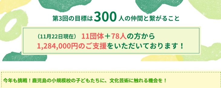 今回、私たちは過去2回の実績を踏まえ、プロジェクト終了までに300名の方々からのご支援をいただけることを目標としております。