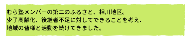 ※現在SNSなどを通じて参加学生を募集する予定ですが、万が一学生が集まらなかった場合も、むら塾のメンバーでイベントを実施いたします。