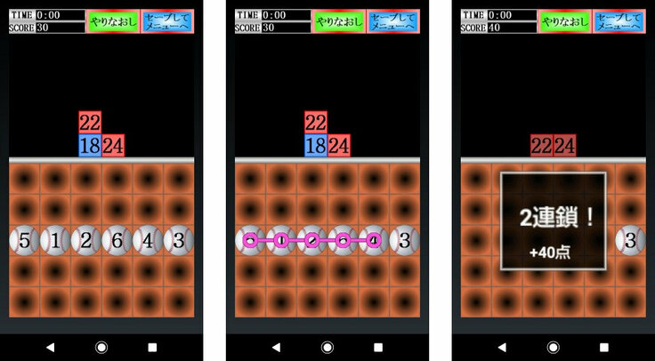 上図左の状態から、合計が「18」になるように数字ボールをつなぎます。すると、「18」と書かれた青いブロックが消え、「18」の上の「22」のブロックが落下してきて「22」と「24」のブロックが並びます。2つとも同じ赤色なので自動的に消え、このステージはクリアとなります。