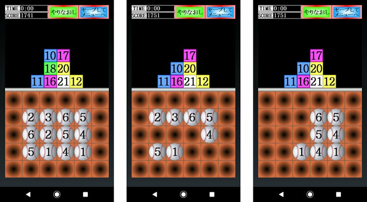 ボールエリアの「数字ボール」をラインでつなげ、その合計がブロックに書かれている数字と一致すればそのブロックは消えます。上図では、ブロックに「12」と書かれているので、「3」「4」「5」の数字ボールをつなぎ、合計が「12」となったため、上図右のようにブロックが消えてステージクリアとなりました。