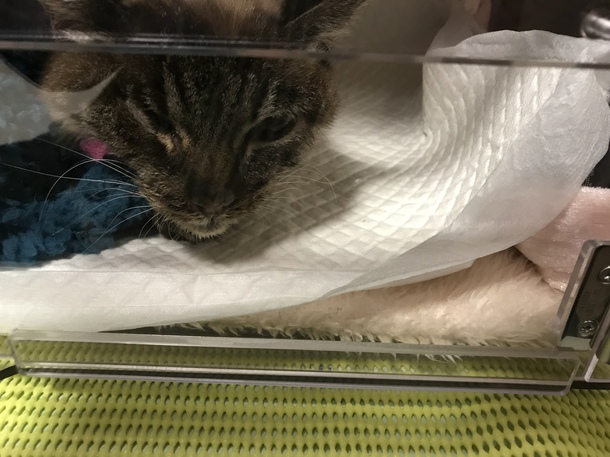 ぴっちゃんは帰ってから、少しだけジュレ食べたけどぐったりしてたので、さっそく酸素室に入りました。30分くらい入ってたら気分が良くなったようで起き上がったので外に出してご飯あげたら、結構食べてくれました。それから、また酸素室入って起きてお水飲んだりと、酸素室にはいるとだんだん元気な感じになります。