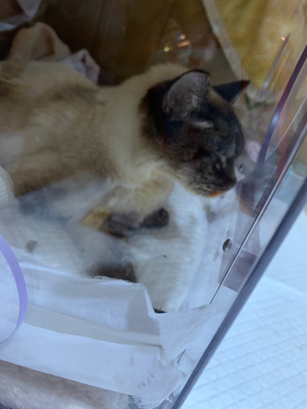 ぴっちゃんは酸素室が楽みたいです。ケース越しだとちょっとわかりにくいですが起きているところです。こちら側は目が悪いので眠ってるようにみえてしまいます。でも起きていて可愛くこちらをみてくれてます。