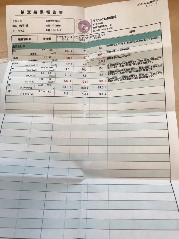 ぴっちゃんの数値は横ばいです。体温が低くて、体重も軽くなっているので、点滴をしてもらいました。胸水はたまってなかったです。お薬と酸素室のおかげかなと思います。