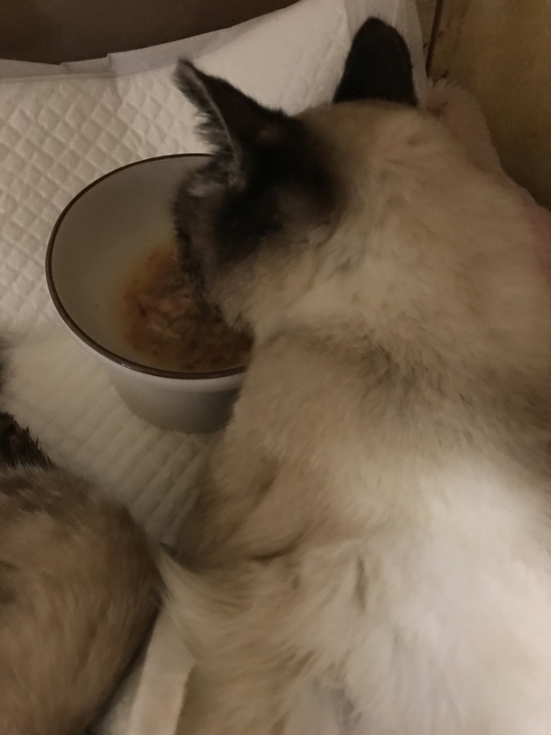 ぴっちゃんは、酸素室でお食事しています。病院は疲れるので、帰ってすぐはあまり食べなかったけど、今あげたら一袋はたべてくれました。