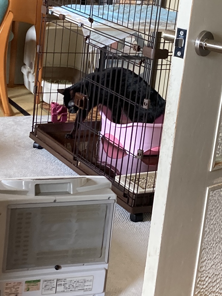 昨夜の夜中から絶食のハチは、ゲージを抜け出しクマのご飯を盗み食いして