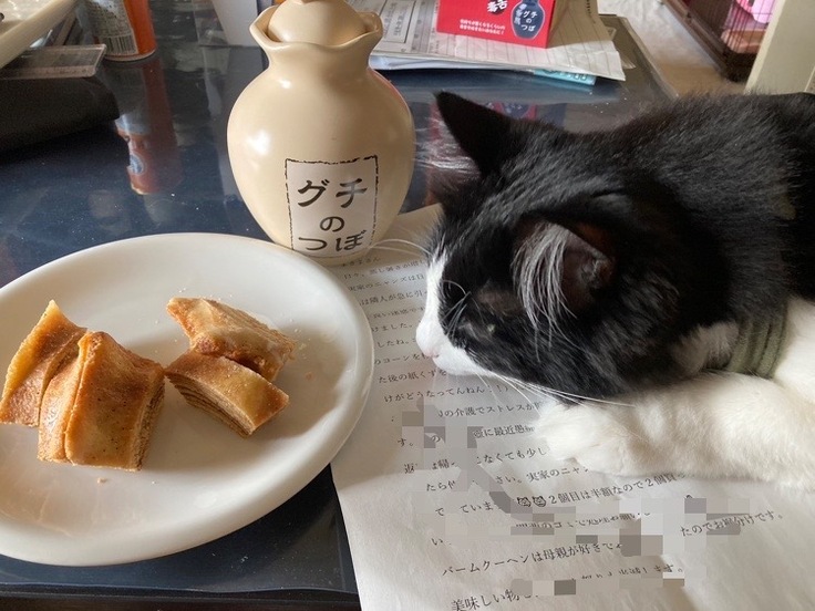 ハチもお手紙読んでます。バームクーヘン狙いながら・・・・