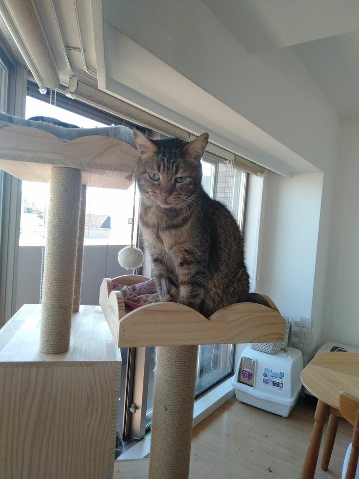写真:トト初猫タワー (トトが病気になってから購入した猫タワーなので、まだ一度も登ったことありませんでした。幹細胞治療してから、少し元気になって初登りです!)