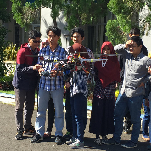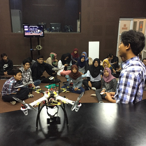 ロンボク島でドローンを使った撮影を予定しているDhani君が、みんなにその制御装置とカメラのリモートコントロール技術について説明しました。ちなみにこのドローンは、彼がパーツを買って来て組上げたものです。