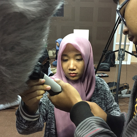 一方、こちらはロケ用小型アンプ、Σ332を手にして「音が違う!」と驚いているIda(左)とAnggi(右)です。中央のAdityaはOJTでやってきていて、今日は「講師」を務めています。