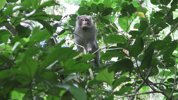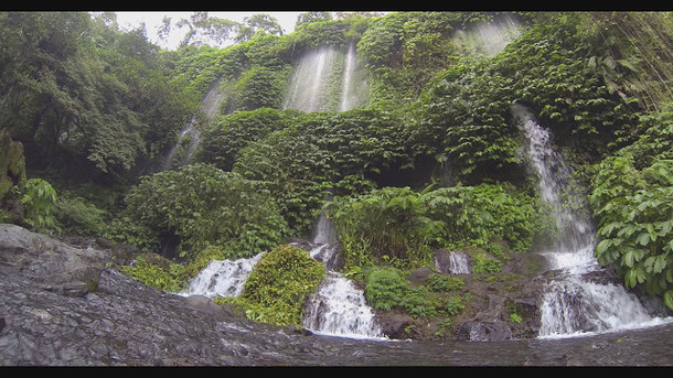 左の二重滝の映像は上の写真の場所から、そして右の映像は、そこから20分山道を下った場所から再びMutiaraが撮影したものです。全体像を説明するLS(Loose Shot)と滝の特徴を捉えたMS(Middle Shot)が「見おろす」「見あげる」というカメラポジションの変化もあって効果的に表現されています。