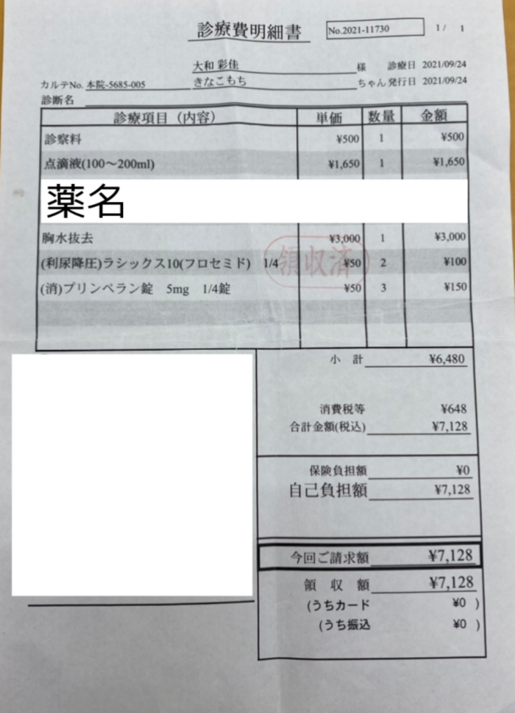 約100ccの胸水を抜き点滴をしてもらい、利尿剤と食欲増進剤を処方してもらいました。