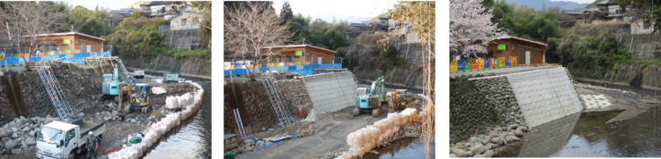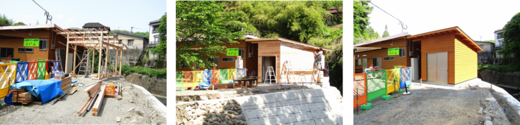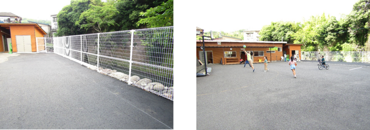 施設復活への前段となる河川護岸工事は、当初の予定より一年ほど遅れて2021年11月にスタートし、2022年3月に終了しました。河川工事終了と同時に「遊具・教材保管倉庫」の建設に着手し、その後「園庭のアスファルト補修」、「防護フェンスの設置」と順次工事を行い、全てが整った6月中旬に施設移転の手続きを終えることができました。