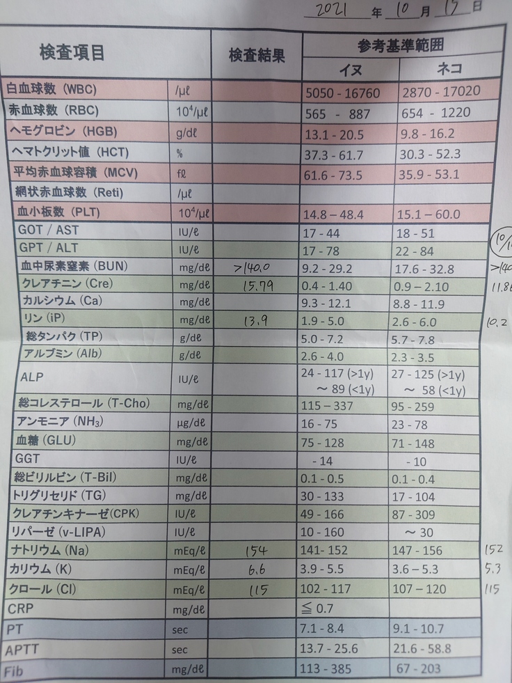 左の腎臓がかろうじて機能している状態で、血液検査の結果BUN血値140以上(測定不能)