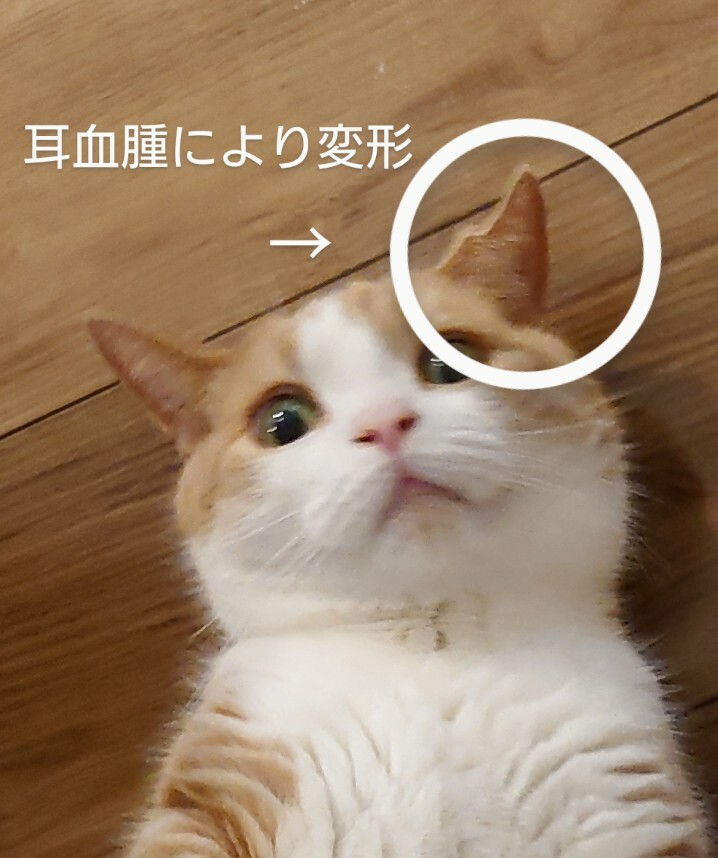 すぐさま注射器を使い、耳に溜まっている血を抜き、軟骨の炎症をとるためステロイド剤を投与しましたが、一度折れ曲がった軟骨は戻ることはなく、左耳は変形したままです。