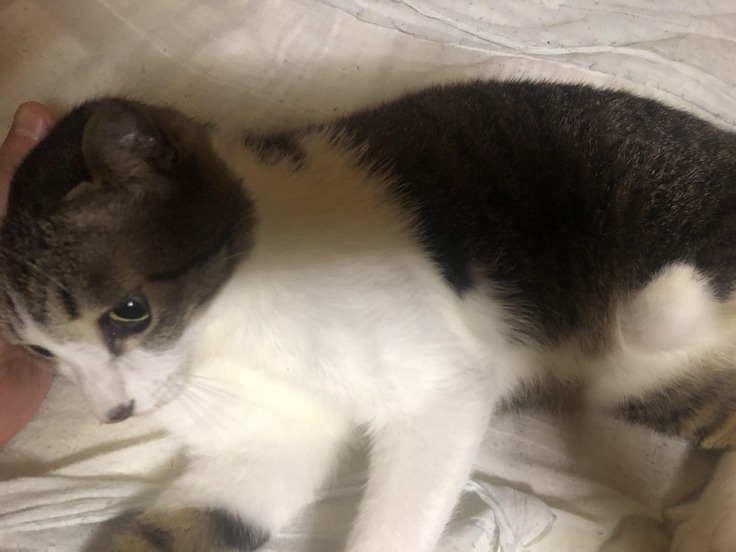 この猫は人の仕掛けた罠(病院の先生の話ではトラばさみだろうとのこと)によって両足に大けがを負っているところを保護しました。左足は骨が飛び出し骨折しているのがはっきりとわかる状態でした。右足も肉がはげ骨がむき出しになっている状態でした。すぐに動物病院へ連れていき手術、治療を行いました。病院の先生のお話では左足は確実に切断しなければならないほどの怪我で右足も回復の度合いによっては切断をするかもしれないといわれましたが動物病院の先生のご尽力もあり右足は湿潤療法と治療を行い完治することができました。しかしながらこの治療も約3週間、毎日包帯を取り換え傷口に薬を塗りラップで覆いまた新しい包帯に取り換えるという作業を行ってまいりました。