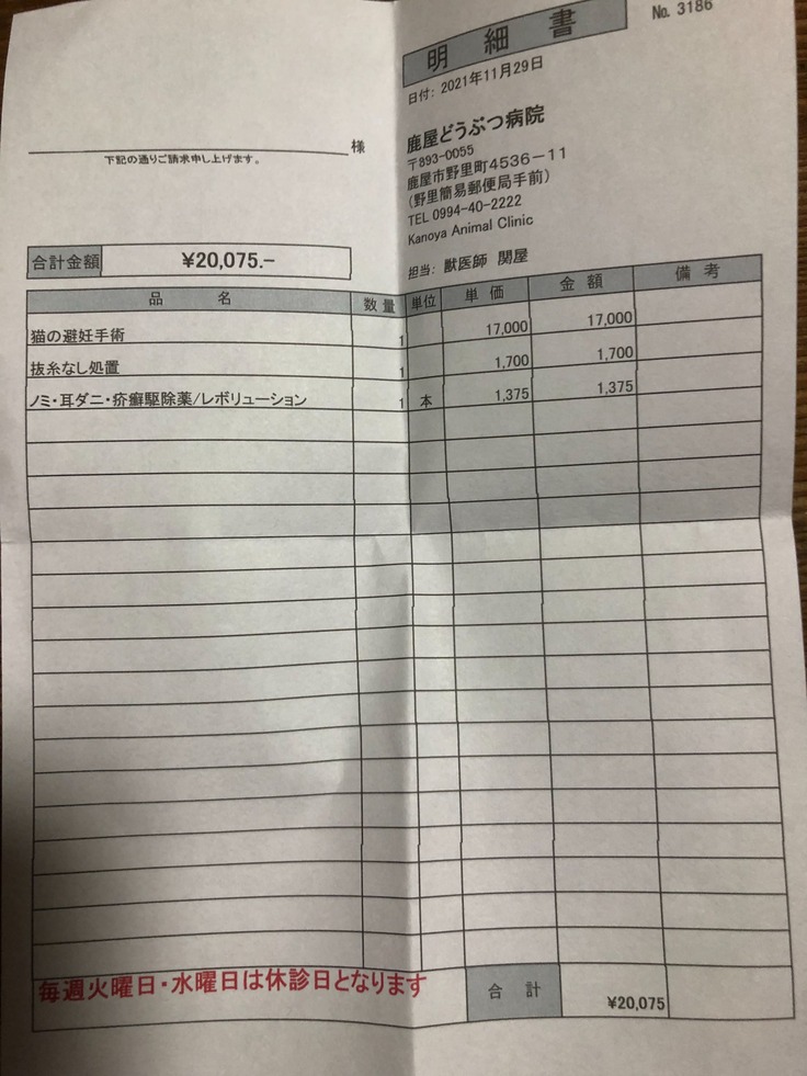 11月28日に保護した猫の避妊手術に行ってきました。