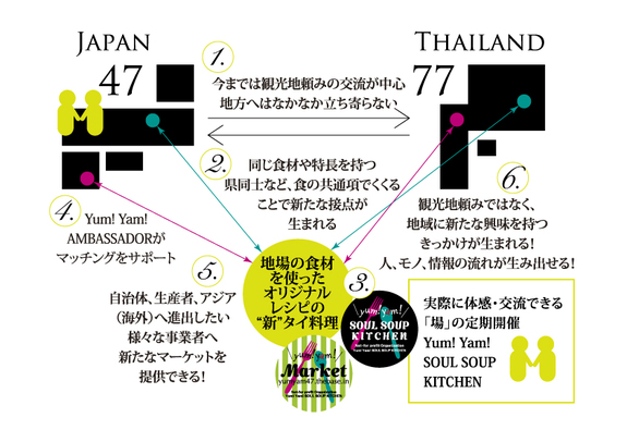 活動自体は定期開催の“タイ料理で47県のご当地の食や観光を紹介するフードイベント”=Yum! Yam! SOUL SOUP KITCHENを中心にしており、イベントがまず各県との深い関わりを持つきっかけ作りとして機能していて、イベント開催の後からさらなる産地との関わりがスタートする。