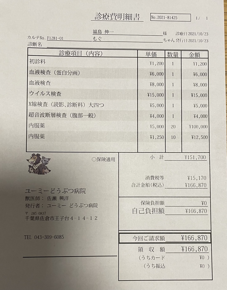 もぐの寛解(投薬終了)までに最低約¥1,338,250が必要となります。