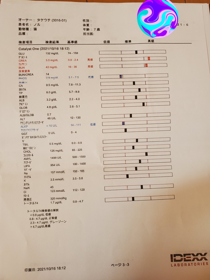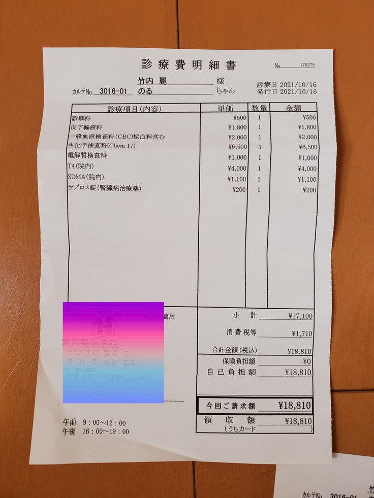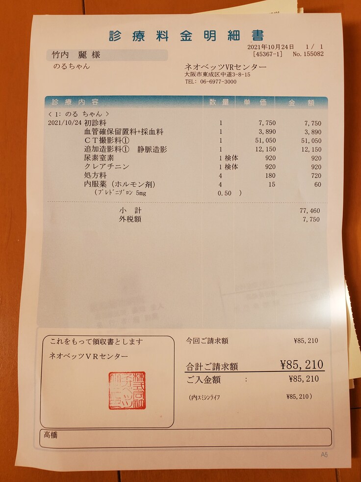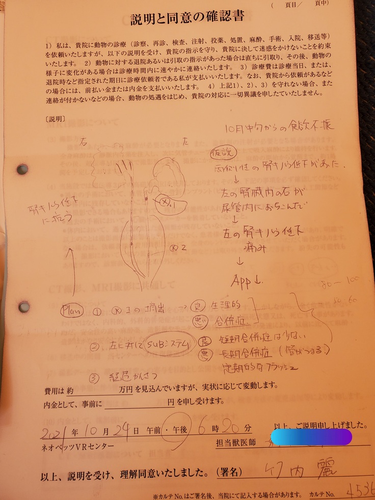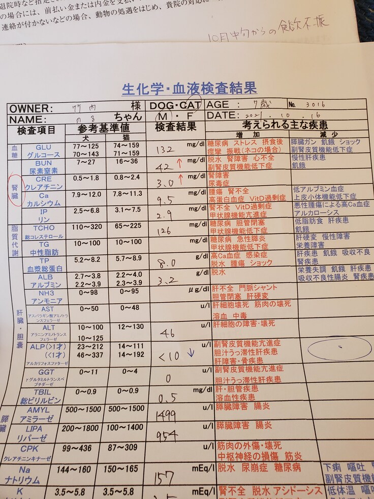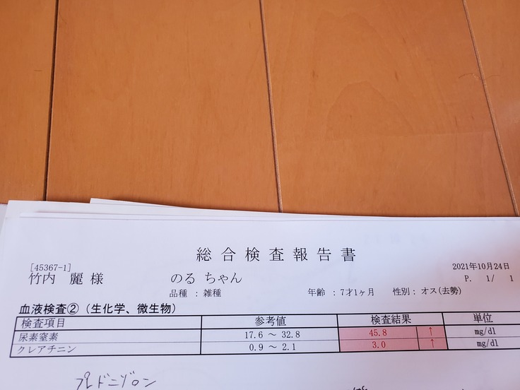 しかし10月中旬、急に食欲が落ち不信に思い病院へ行き血液検査を行うと腎機能低下と診断されました。