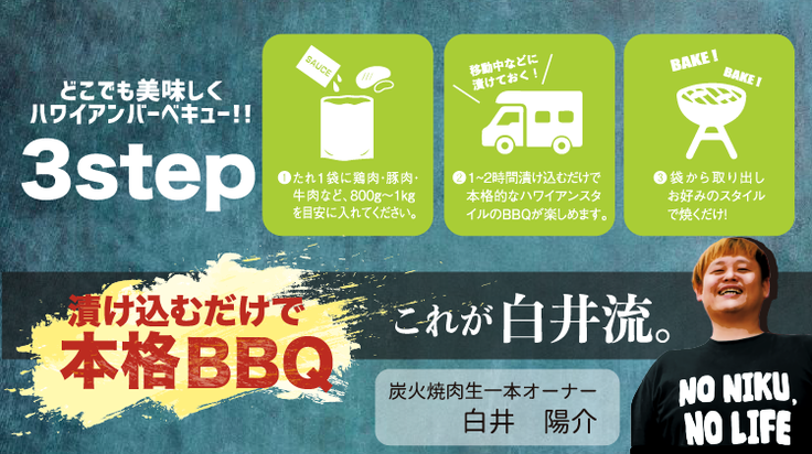 ご家庭で手軽にプロの味をお楽しみいただける『白井BBQソース』は 準備の負担を軽くした簡単3ステップ!