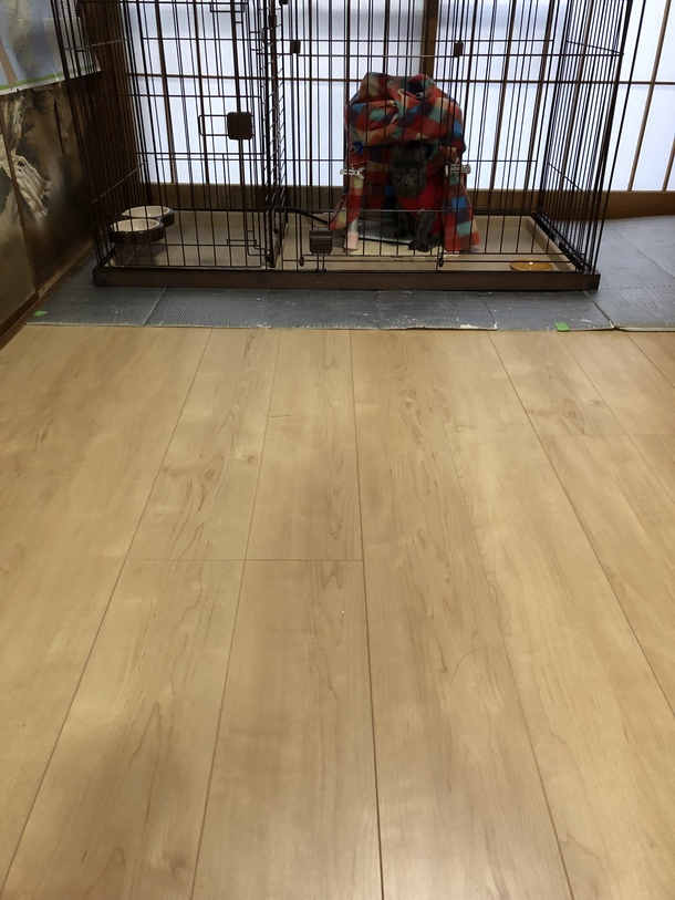 今まで畳でがんばってきましたが、臭いがかなりきつかったのと、ちぃちゃんがゲージ生活になってしまうのでフローリングにしました♡年内にはと思ってましたが意外と早くできました。とりあえずフローリングにしましたがこれでは硬いし滑るのでこれから柔らかい汚れを拭ける物を敷く予定です(* ᴗ͈ˬᴗ͈)”