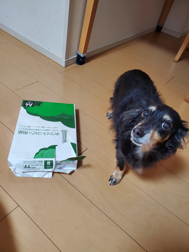 コピー用紙の袋破こうと頑張ってました。