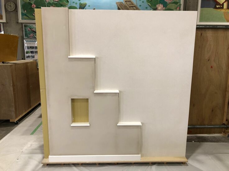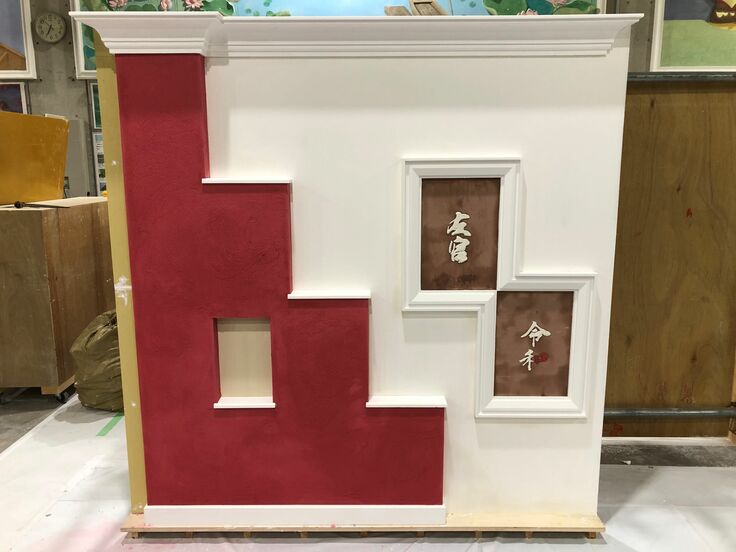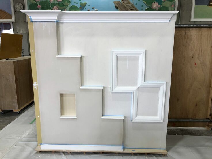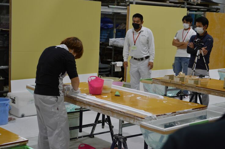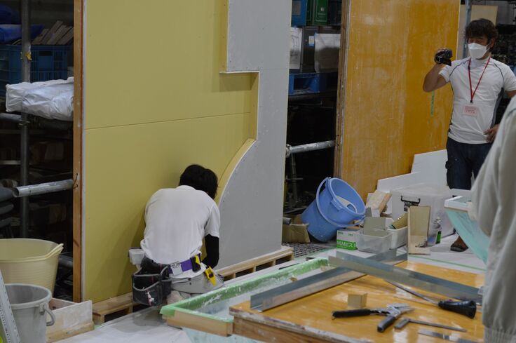 左官職種では、鏝と呼ばれる左官独特の道具を使い、壁を想定した軽量鉄骨+石膏ボード張り下地に石こうや石灰を主材料とした塗り壁を造ります。また、石こう置引きの左官技法を用いて、モールディング作業を行います。特に接合部の美しさが評価されます。