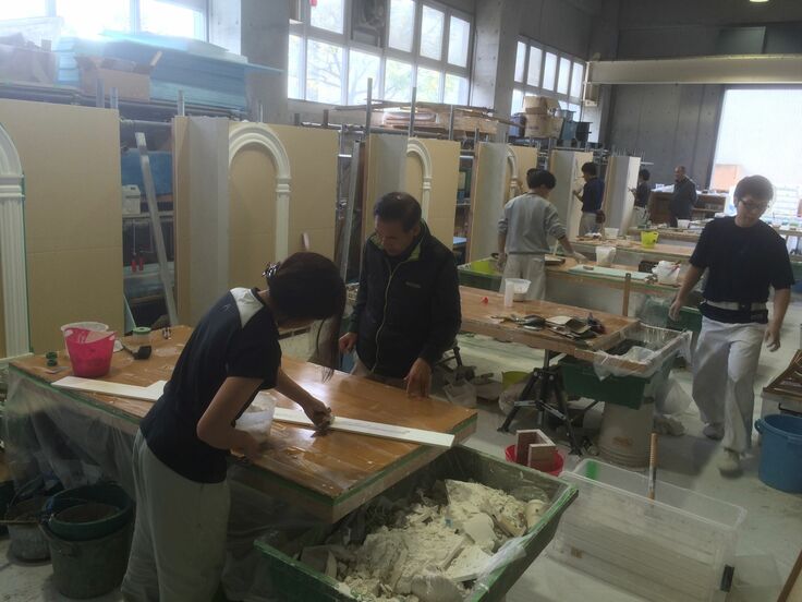 焼石膏を使用した置引き作業では、その性質を熟知したうえで、いかに効率よく丁寧な作業ができるかがポイントとなります。作業台に水で溶いた焼石膏を流し、どのタイミングで型を通すか、瞬時の判断で造形品の良否が決まります。無駄なく素早い動きで指定寸法に合わせて切断・加工したものを取付けたモールディングの接合部の見栄えが求められます。