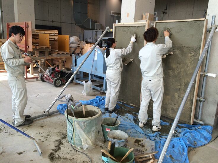 日本の風土に適した自然素材の「漆喰(しっくい)」や「珪藻土(けいそうど)」の鏝塗りの技を必要とする課題は、多能工としてもより実践的な構成となっています。これらの施工を行うための下地は、骨格部分を軽量鉄骨と石膏ボードで制作し、ジョイントやビス穴は、パテを鏝やヘラ等を使用して平滑に仕上げます。下地をよく知っている左官技能者は、工事現場において内外装施工のプロフェッショナルとして活躍することが可能となります。