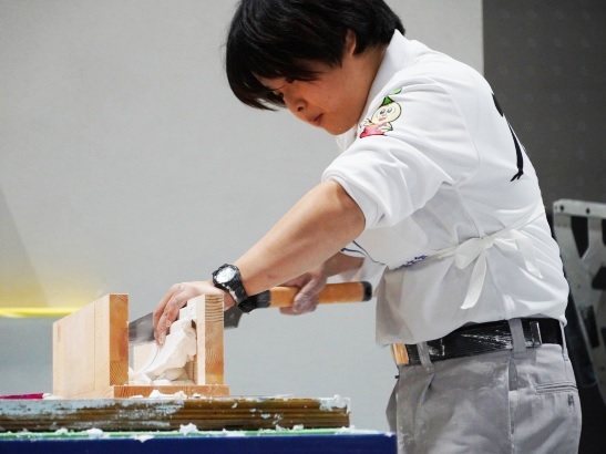 技能五輪全国大会における左官職種では、日本伝統の湿式仕上げと乾式仕上げを融合させた課題に無駄のない俊敏な動きで、競技に挑みます。