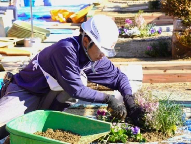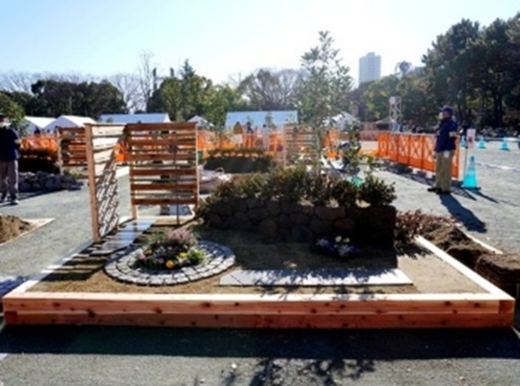 造園職種では、決められた区域内に石積みや石張り、木製ベンチ、池、木柵、植栽、芝生張りなどを行い、和風と洋風の造園技法を織り交ぜ、外構工事における総合的な造園技能の熟練度を競います。