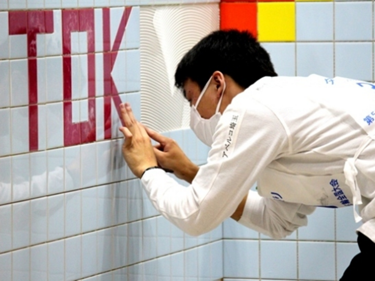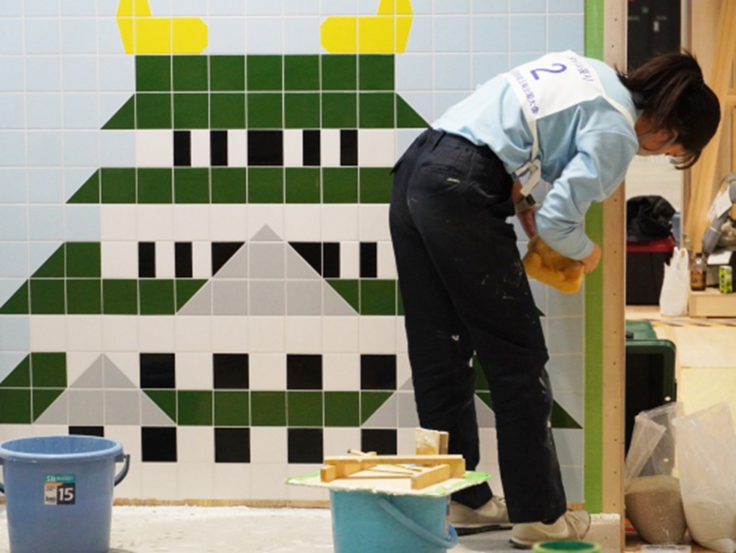 タイル張り職種では、壁および床を想定した下地にタイルを張り、目地詰めを行います。課題にはタイル張りに必要な要素をできるだけ取り入れており、様々な角度から技術・技能とその作品が審査されます。