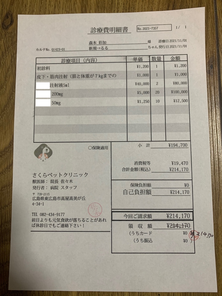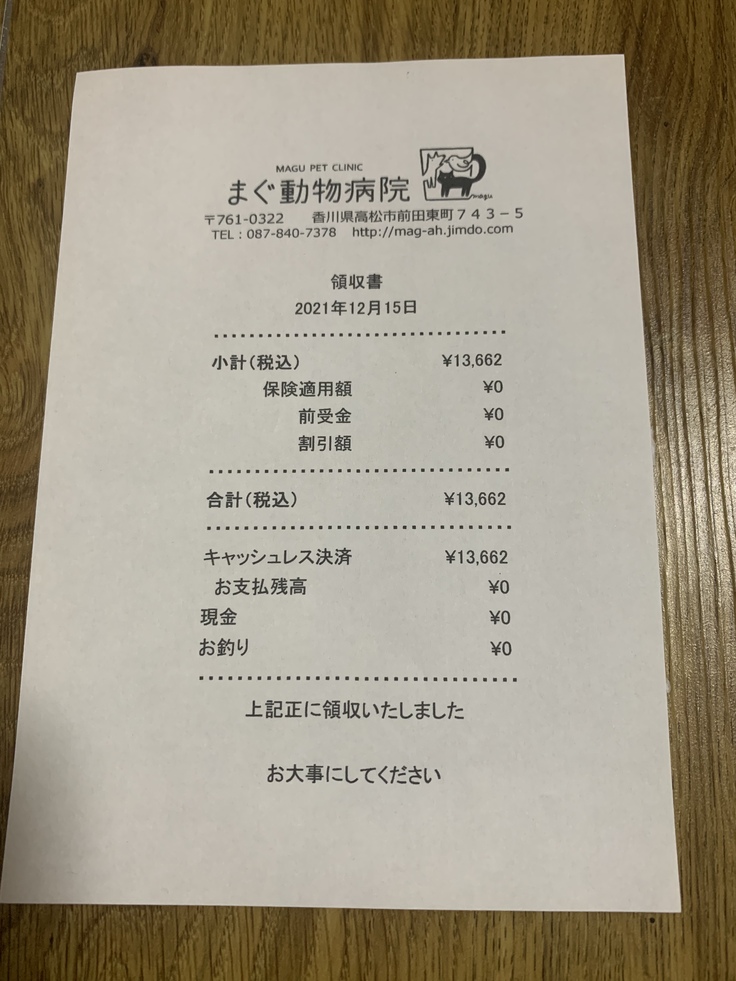 (この日はMシュナちゃんも診てもらったため、こちらの請求書には合計金額が載っていません)