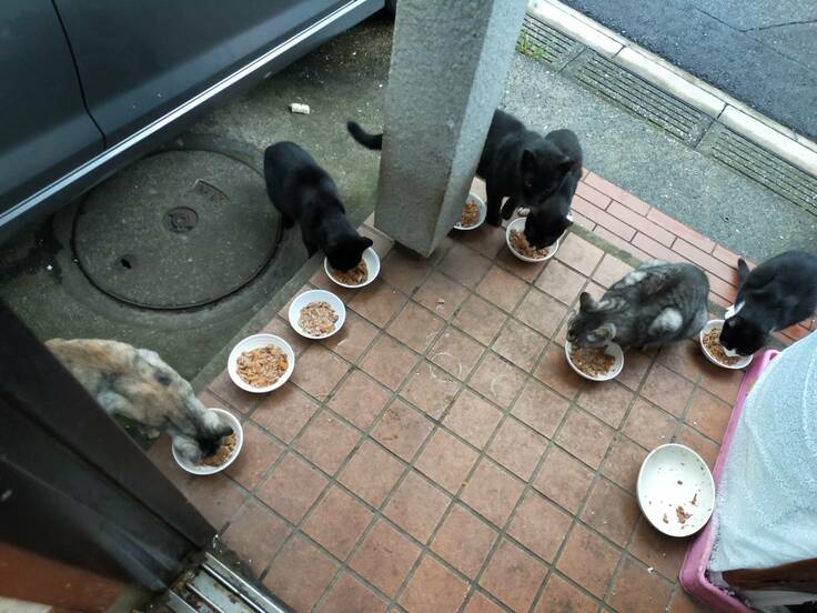 この餌に呼びよせられた野良猫達が集まり、結果、約40匹もの外猫達が近所を徘徊するようになってしまったのです。