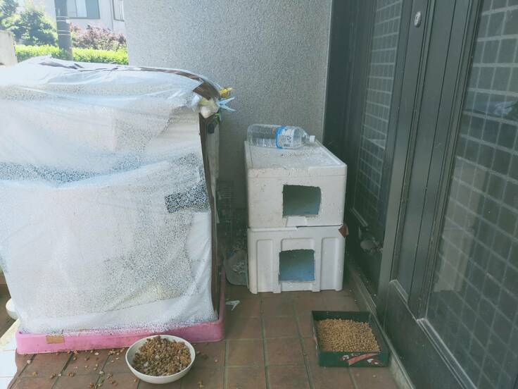 食事の世話はもちろんの事、外猫達が安心して過ごせるようにと、発泡スチロールで作った簡易ハウスなんかも設置しております。