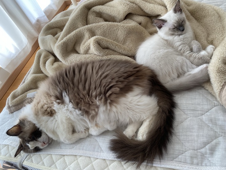 先住猫のラグドール2頭がいまして、うち1頭の名前フーガを親のように感じていた様子で、寄り添って寝てることが多かったのです。
