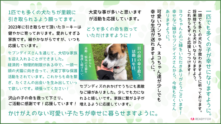 いただいたご支援と応援は、日々の活動の原動力です。私たちは、この応援を力に変え、「目の前の命を救う」という信念のもと、高齢や病気の犬猫を含め、救える命を選ばず活動を継続してまいります。
