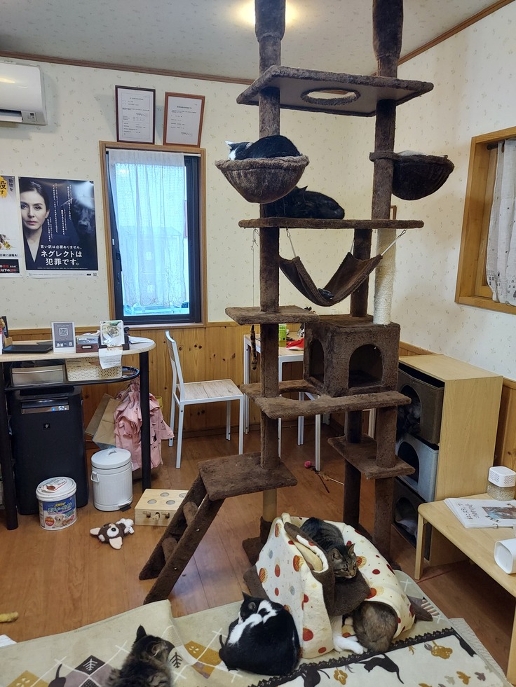 自分たちで飼っている猫が8匹います。スタッフ猫ちゃんです。多頭飼いの方から引き取った子猫と大学の入り口前に捨てられた子猫や迷子の子猫を保護して育てていました。保護を意識し活動を始めたのは猫カフェを開業してから間もなくでした。