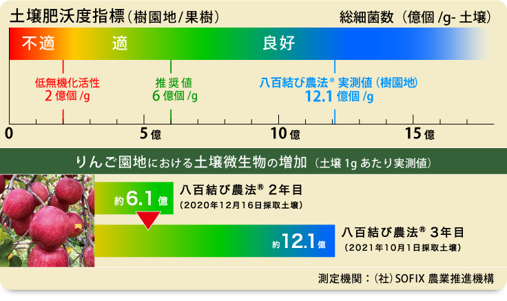 ですが、私たちは特別な土壌診断方法で微生物数を量り、今回返礼品にご用意したりんごの園地はその結果、土壌1gあたり12.1億個の微生物が活性した土壌であることがわかりました。