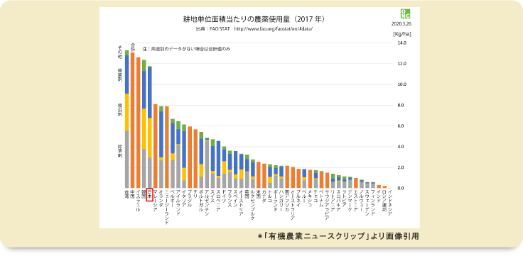 日本は、耕地単位面積当たりの農薬使用量ではずば抜けて高い世界トップ5*に入っており「農薬大国」とも呼ばれています。