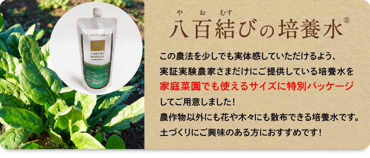 「八百結び農法®」に用いる農業用資材「八百結びの培養水®」をつけた返礼品も特別にご用意いたしました。