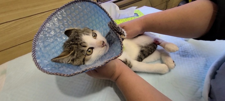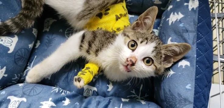 私たちとしても、交通事故に逢ったばかりの猫の保護は初めてだったので、詳しいことはわかりませんでしたが、軽く診察をした結果、左側から車が来ていたようで左肩から先が骨折しており、左足には深い切り傷ができていることを確認できました。