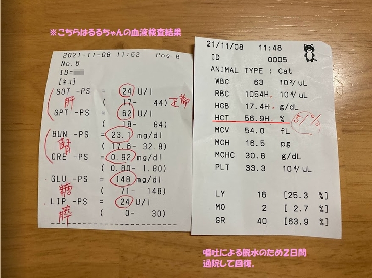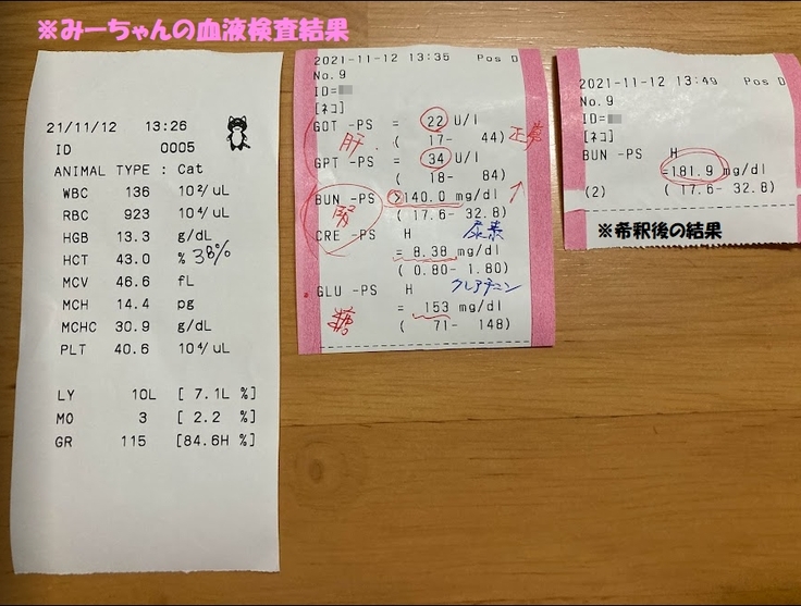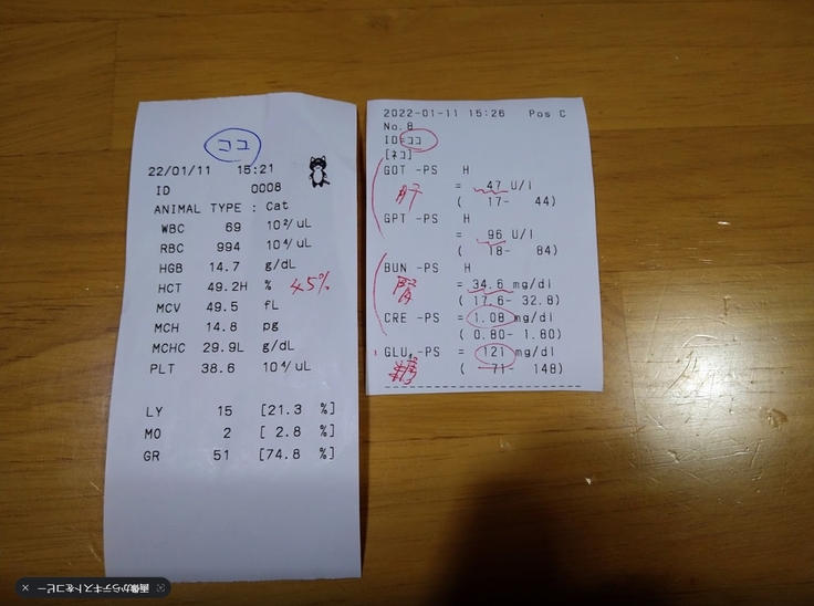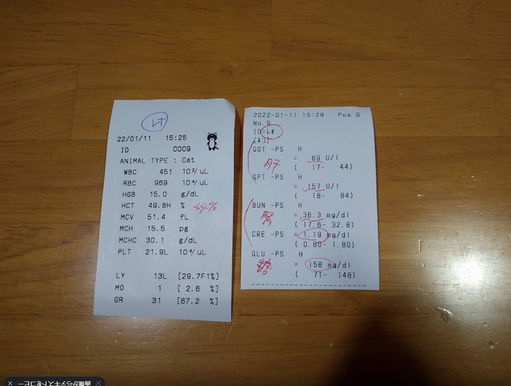 2匹とも腎臓のBUNだけが若干ですがオーバーしていて
