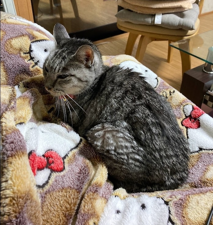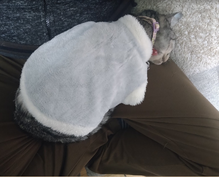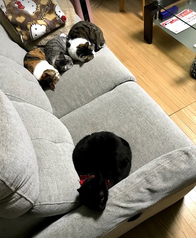 ほとんど主人か私、どちらかの膝の上に寝ています。