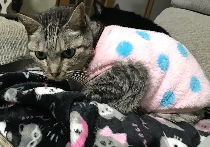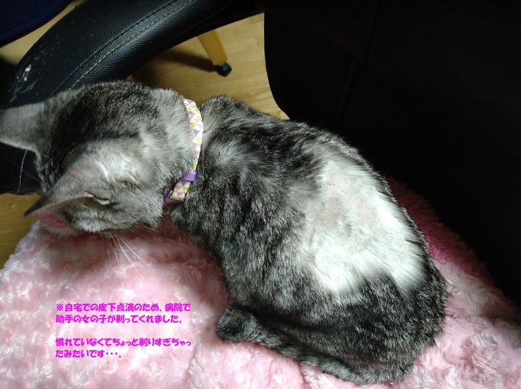 みーちゃん。毎日の点滴をじっとしてがんばっています。緩和ケアの治療はずっと続いていくので、継続していくためにご支援いただけるとありがたいです。