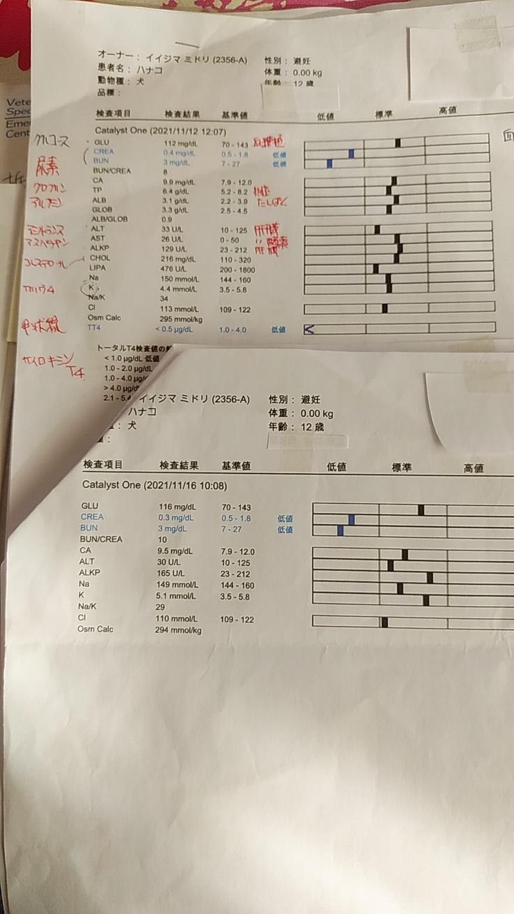 本当に嬉しかったです。でも、嘔吐と震えは続き、また、気温.湿度の変化で花子の体調が違う、A病院での血液検査日にその違いを相談、血圧、血糖値等を調べてほしいと言うと血糖値が27と言われ、食事をとらずの検査だから低めなのか。
