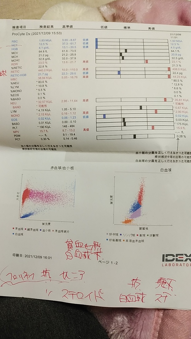白血球が異常に高くなってしまっております。これは、数時間の血管を通しての点滴でも、数値が変わっていません。