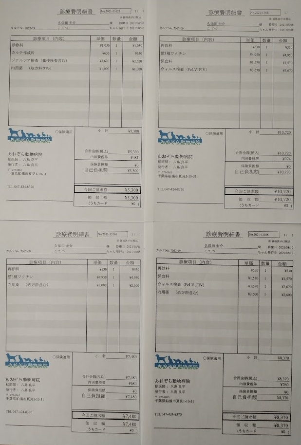今回の手術費と治療費は想定外だったため、私の保護猫活動を手伝ってくれているパートナーの方に建て替えてもらいました。(そのため、診療費明細の名義は私とは異なっております。)